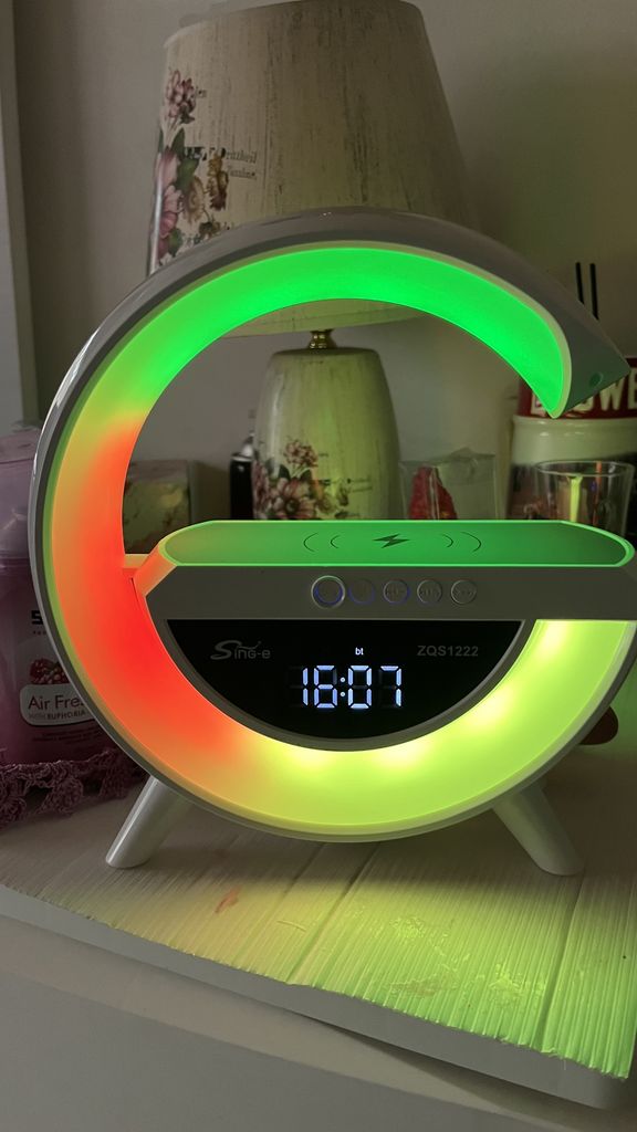 دارای شارژ بی سیم چند منظوره دارای بلندگو های یکپارچه همراه با نور LED دارای پایه رومیزی سازگار با گوشی های هوشمند دارای نورRGB LED