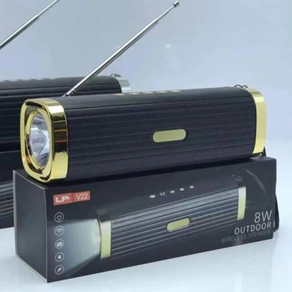 در مورد ویژگیهای ظاهری اسپیکر lp مدل LP-V22 میتوان به شکل ظاهری مکعب و زیبایی و مدرتینه و مینیمال بودن آن اشاره کرد ، که هنگام استفاده از آن با توجه به هندسه و زیبایی رنگهای به کار رفته در ساخت آن ، حس خوبی را به مصرف کننده القا میکند. عضو جدید خانوادهLP یک صفحه کنترل با پوشش شفاف و رنگ متضاد با رنگ بدنه بر روی بدنه خود دارد که باعث افزایش زیبایی ظاهری محصول شده است . در این صفحه کنترلی دکمههای پخش و توقف – صدا کم – صدا زیاد - تغییر حالت و لامپ اضطراری که در انتهای اسپیکر تعبیه شده قرار گرفته است . همچنین در قسمت پشت دستگاه میتوان قسمت تو رفتهای که وجود دارد که در آن درگاه ورودی کابل شارژ – فلش - کارت حافظه – کلید پاور و کابل AUX را مشاهده کرد ، در قسمت جلوی اسپیکر نیز ستلایت دو با قدرت پخش صدایی واضح و نسبتا بلند همراه توری محافظ روی آن خودنمایی میکند. در بسته بندی به همراه اسپیکر کابل شارژر مخصوص و همچنین بند مچی متصل به اسپیکر موجود است . در زیر اسپیکر دو لاستیک کوچک جهت قرار دادن آن بر روی سطح دلخواه و جلوگیری از لیز خوردن آن قرار گرفته است . همچنین یک آنتن رادیویی به طول 35 سانتی متر بر روی اسپیکر قرار دارد که باعث دریافت بهتر سیگنالهای رادیویی میگردد. باتوجه به قابلیت دریافت سیگنالهای رادیو اف ام بعد از تغییر حالت به رادیو با نگهداشتن کلید پخش توقف به مدت سه ثانیه اسپیکر به طور خودکار سیگنالهای قابل دریافت را جست و جو میکند و به مدت سه ثانیه هر ایستگاه رادیویی پخش میشود در صورت تمایل مجددا میتوان کلید پخش و توقف را نگهداشت تا همان ایستگاه رادیویی برای پخش انتخاب گردد .