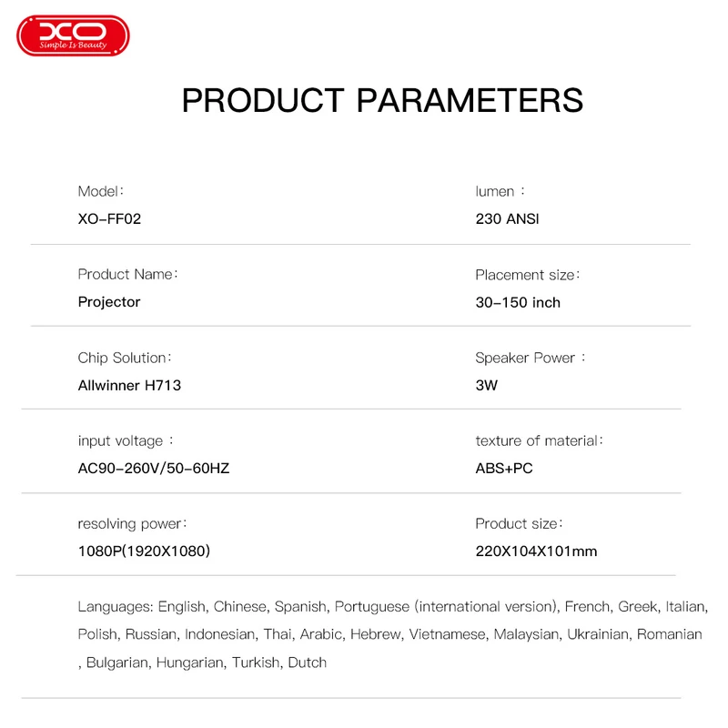پروژکتور XO FF02 دارای ویژگیهای متنوعی است که تجربه تماشای خانگی و حرفهای را ارتقا میدهد. این پروژکتور از وضوح Full HD 1080p بهره میبرد که تصاویر شفاف و با کیفیتی را ارائه میکند. روشنایی آن به 3000 لومن میرسد که باعث میشود حتی در محیطهای پرنور هم تصاویر به وضوح دیده شوند. تکنولوژی 3LCD که در این پروژکتور استفاده شده، رنگهای زنده و روشن را با تعادلی مطلوب بین نور سفید و رنگی نمایش میدهد. پشتیبانی از ویدیوهای 4K و HD,کیفیت تصویر 1080p HD,بلوتوث 5.0,زاویه چرخش 150 درجه, زاویه چرخش بالا,قابلیت تنظیم فوکوس از ویژگی های این دستگاه است.قابلیت پخش تصویر تا اندازه 300 اینچ (762 سانتیمتر) از دیگر امکانات برجسته XO FF02 است. همچنین این دستگاه دارای قابلیت اصلاح خودکار کیستون است که به کاربر کمک میکند تصویر را بهراحتی و بدون نیاز به تنظیمات پیچیده روی دیوار تنظیم کند. دانگل Android TV و قابلیت Chromecast داخلی نیز امکان پخش مستقیم محتوا از سرویسهای استریمینگ مانند نتفلیکس و یوتیوب را فراهم میکند.از دیگر ویژگیها میتوان به بلندگوی 5 واتی داخلی، پورت HDMI برای اتصال به دستگاههای خارجی و طراحی جمع و جور و سبک اشاره کرد که حمل و جابجایی آن را ساده میکند.
